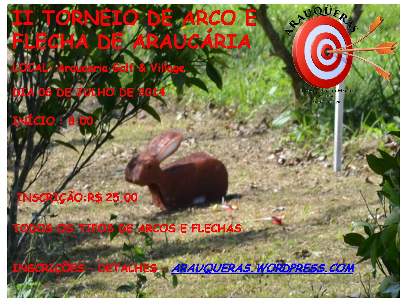 Com o objetivo de proporcionar a participação dos arqueiros de Araucária em um evento esportivo e recreativo o Grupo Arauqüeras está convidando todos os arqueiros para o segundo Torneio de Arco e Flecha de Araucária. O local será no espaço Araucária Golf e Village, veja o mapa de como chegar, a 2 Km do centro de Araucária.