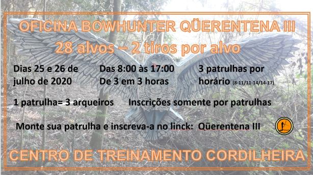 O Grupo Arauqüeras está convidando todos os arqueiros e simpatizantes para a 3ª Oficina Bow Hunter para arcos tradicionais Qüerentena III – Prova a ser realizada procurando atender os requisitos do isolamento social e proporcionar o mínimo de interação entre arqueiros fora de sua convivência e ao mesmo tempo proporcionar uma certa competitividade . O local será no espaço CENTRO DE TREINAMENTO CORDILHEIRA no município de Araucária – PR. INSCRIÇÕES AQUI